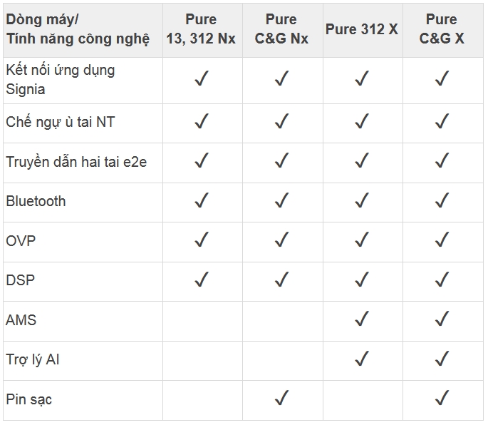 BẢNG SO SÁNH TÍNH NĂNG CÔNG NGHỆ CỦA CÁC DÒNG MÁY TRỢ THÍNH PURE